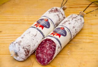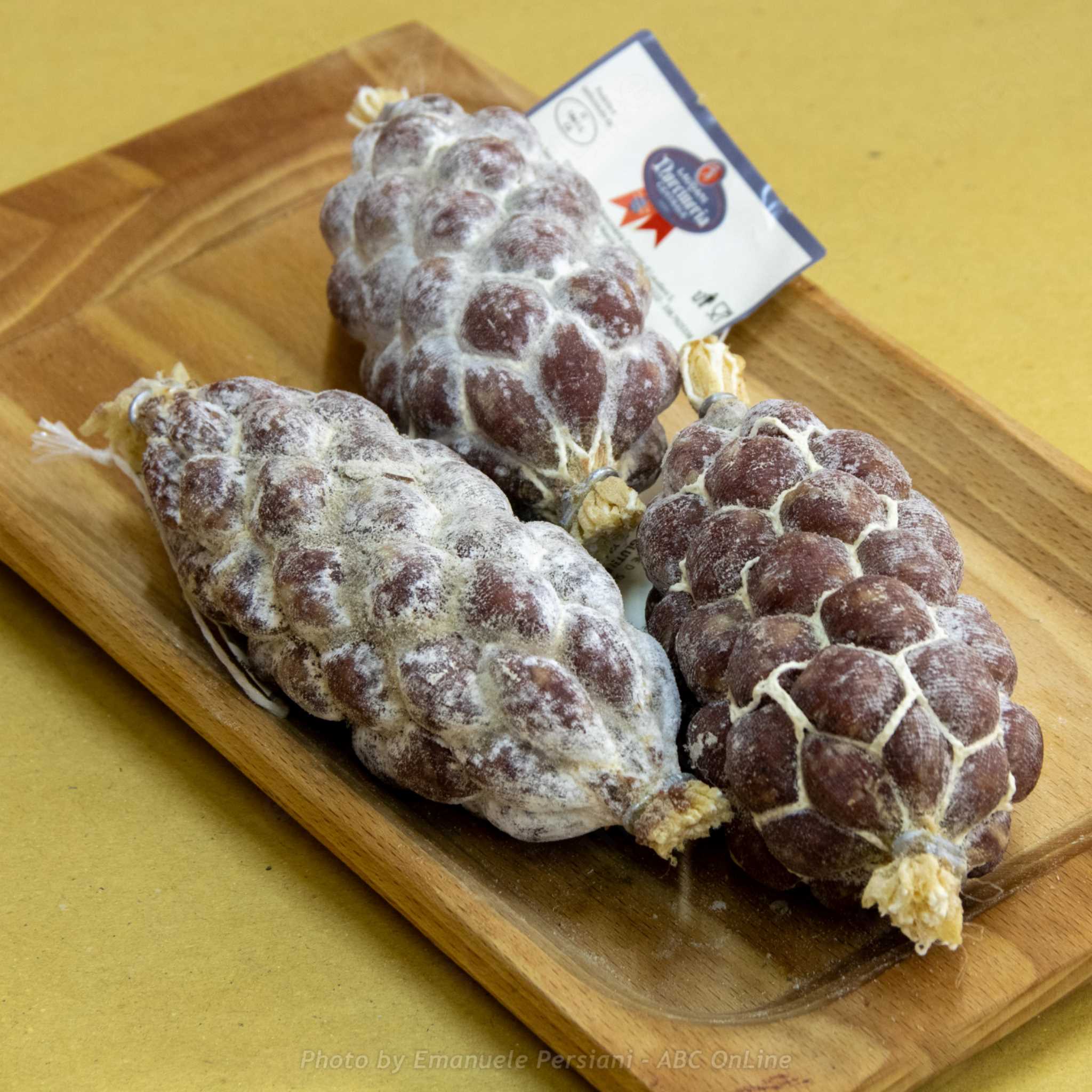 Salame fatto a forma di pigna, lavorato con carne di suino a grana fine con aggiunta di sale e pepe. Peso circa 300/400 gr.